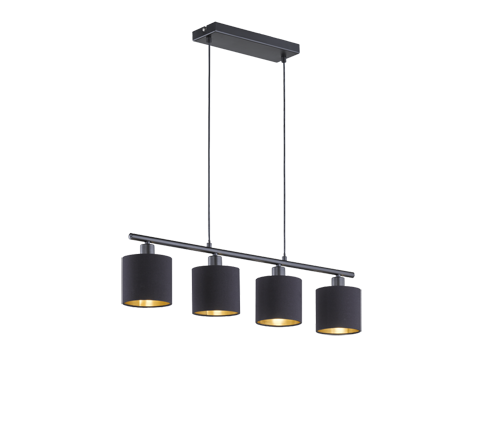 De Trio Tommy hanglamp combineert een strak design met warme details. Met vier textielen lampenkappen in zwart met een gouden binnenzijde en een matzwarte metalen afwerking straalt deze lamp een moderne en gezellige sfeer uit. Perfect voor boven de eettafel of in de woonkamer.
