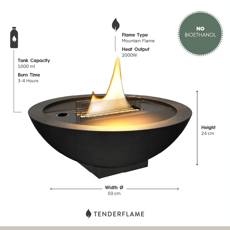 - Rook-, roet- & geurvrij – Brandt uitsluitend op niet-giftig Tenderfuel; geen schoorsteen, gasleiding of ventilatie nodig.