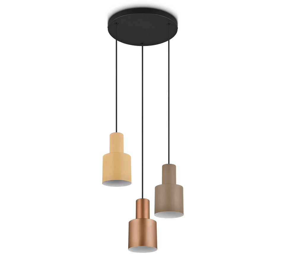 De Trio Agudo hanglamp is een opvallende verschijning die kleur en karakter toevoegt aan je interieur. Met drie metalen lampenkappen in verschillende aardetinten en een strakke zwarte plafondplaat, combineert deze lamp een industrieel design met warme, natuurlijke kleuren. Perfect voor boven de eettafel of in de woonkamer.